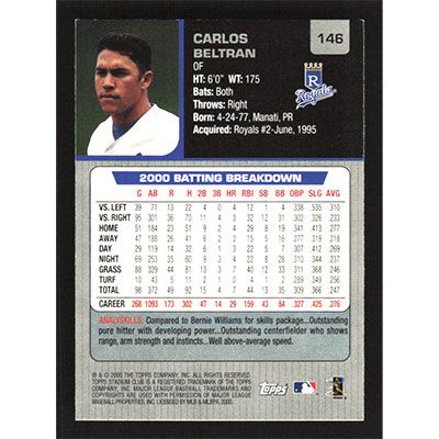 This is a 2001 Stadium Club Carlos Beltran baseball card. The card is #146 and pictures show condition.