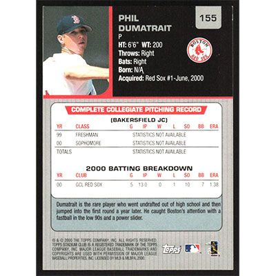 This is a 2001 Stadium Club Phil Dumatrait Draft Pick baseball card. The card is #155 and pictures show condition.