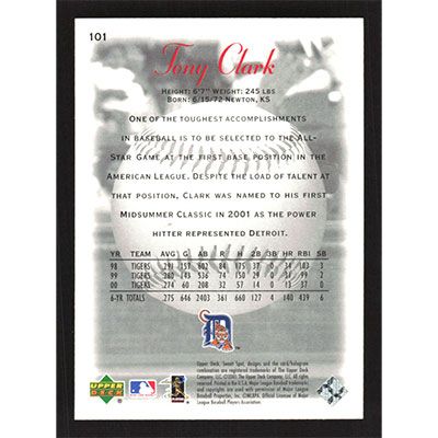 This is a 2001 Sweet Spot Tony Clark baseball card. The card is #101 and pictures show condition.