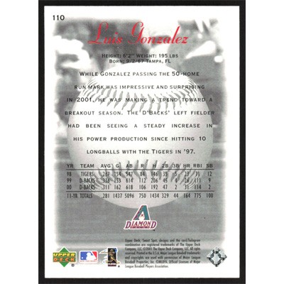 This is a 2001 Sweet Spot Luis Gonzalez baseball card. The card is #110 and pictures show condition.