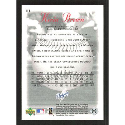 This is a 2001 Sweet Spot Kevin Brown baseball card. The card is #111 and pictures show condition.