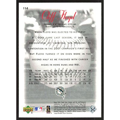 This is a 2001 Sweet Spot Cliff Floyd baseball card. The card is #114 and pictures show condition.