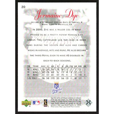 This is a 2001 Sweet Spot Jermaine Dye baseball card. The card is #20 and pictures show condition.
