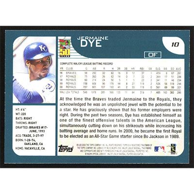 This is a 2001 Topps Jermaine Dye baseball card. The card is #10 and pictures show condition.