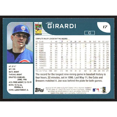 This is a 2001 Topps Joe Girardi baseball card. The card is #17 and pictures show condition.