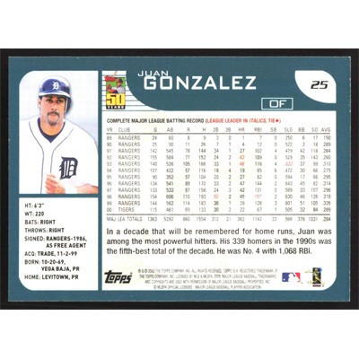 This is a 2001 Topps Juan Gonzalez baseball card. The card is #25 and pictures show condition.