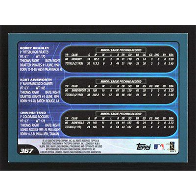 This is a 2001 Topps Bobby Bradley, Kurt Ainsworth and Chin-Hui Tsao Prospects baseball card. The card is #367 and pictures show condition. Team(s): Pittsburgh Pirates/San Francisco Giants/Colorado Rockies