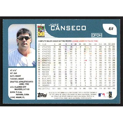 This is a 2001 Topps Jose Canseco baseball card. The card is #61 and pictures show condition.