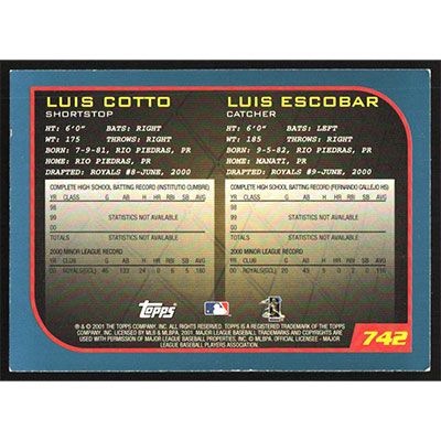 This is a 2001 Topps Luis Cotto and Luis Escobar Draft Picks baseball card. The card is #742 and pictures show condition. Team(s): Kansas City Royals Rookie Card (RC)