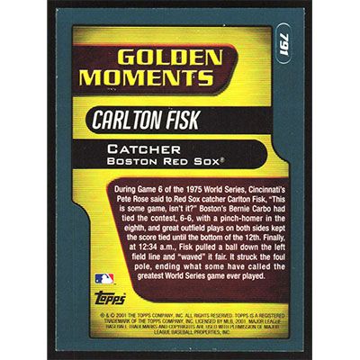 This is a 2001 Topps Carlton Fisk Golden Moments baseball card. The card is #791 and pictures show condition.