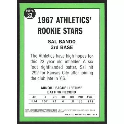 This is a 2001 Topps Archives Reserve 1967 Sal Bando baseball card. The card is #65 and pictures show condition.
