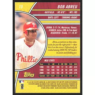 This is a 2001 Topps Reserve Bobby Abreu baseball card. The card is #15 and pictures show condition.