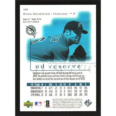 This is a 2001 UD Reserve Ryan Dempster baseball card. The card is #141 and pictures show condition.