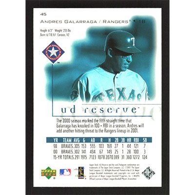 This is a 2001 UD Reserve Andres Galarraga baseball card. The card is #45 and pictures show condition.