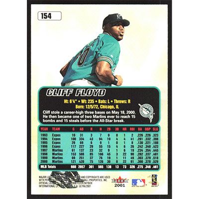 This is a 2001 Ultra Cliff Floyd baseball card. The card is #154 and pictures show condition.