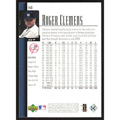 This is a 2001 Upper Deck Roger Clemens baseball card. The card is #140 and pictures show condition.