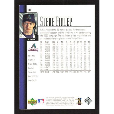 This is a 2001 Upper Deck Steve Finley baseball card. The card is #184 and pictures show condition.
