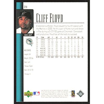 This is a 2001 Upper Deck Cliff Floyd baseball card. The card is #211 and pictures show condition.