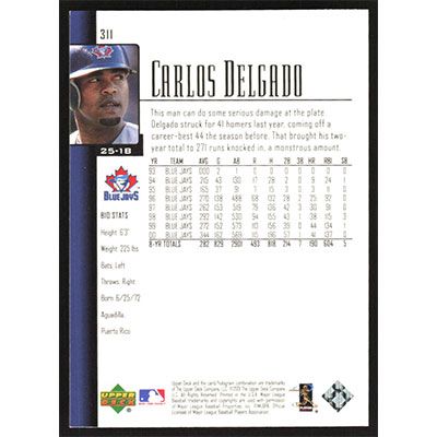 This is a 2001 Upper Deck Carlos Delgado baseball card. The card is #311 and pictures show condition.