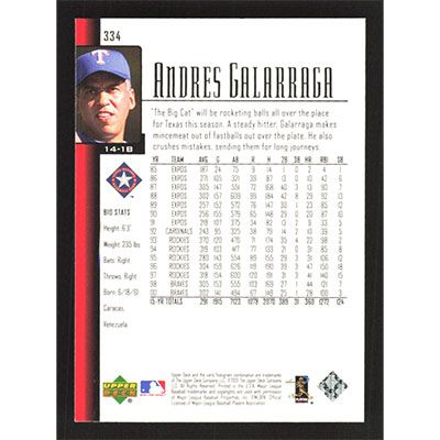 This is a 2001 Upper Deck Andres Galarraga baseball card. The card is #334 and pictures show condition.
