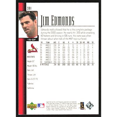 This is a 2001 Upper Deck Jim Edmonds baseball card. The card is #381 and pictures show condition.