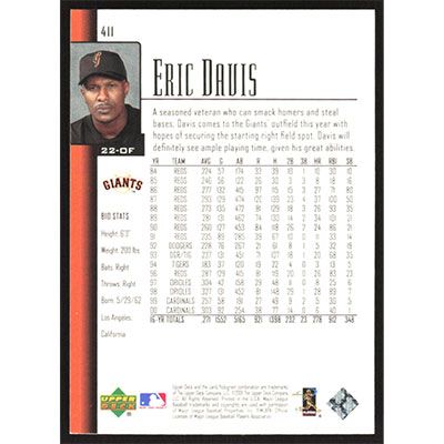 This is a 2001 Upper Deck Eric Davis baseball card. The card is #411 and pictures show condition.