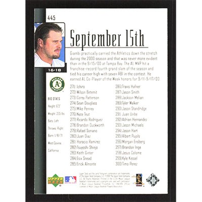 This is a 2001 Upper Deck Jason Giambi Season Highlights Checklist baseball card. The card is #445 and pictures show condition. Team(s): Oakland Athletics