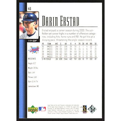 This is a 2001 Upper Deck Darin Erstad baseball card. The card is #46 and pictures show condition.