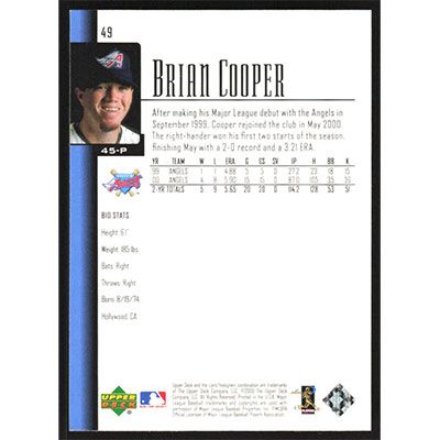 This is a 2001 Upper Deck Brian Cooper baseball card. The card is #49 and pictures show condition.