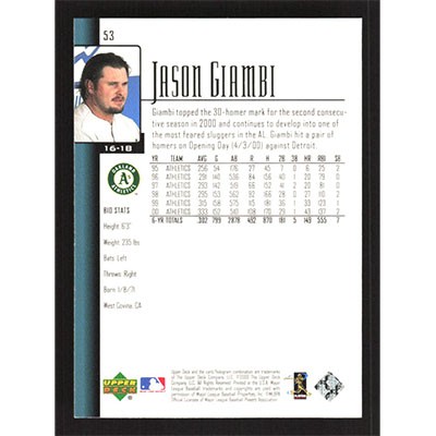 This is a 2001 Upper Deck Jason Giambi baseball card. The card is #53 and pictures show condition.