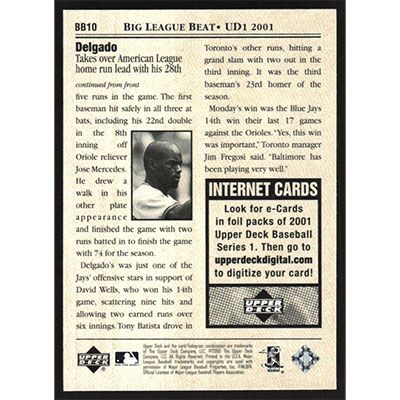 This is a 2001 Upper Deck Big League Beat Carlos Delgado baseball card. The card is #BB10 and pictures show condition.