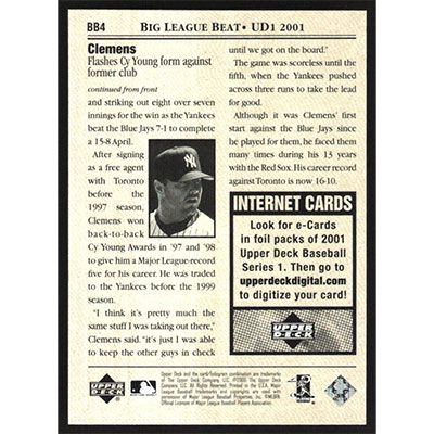 This is a 2001 Upper Deck Big League Beat Roger Clemens baseball card. The card is #BB4 and pictures show condition.