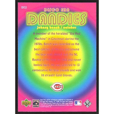 This is a 2001 Upper Deck Decade 1970's Disco Era Dandies Johnny Bench baseball card. The card is #DE2 and pictures show condition. Team(s): Cincinnati Reds