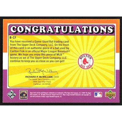 This is a 2001 Upper Deck Decade 1970's Game Bat Carlton Fisk baseball card. The card is #B-CF and pictures show condition.