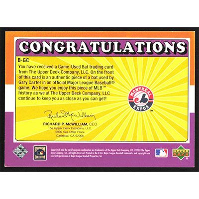 This is a 2001 Upper Deck Decade 1970's Game Bat Gary Carter baseball card. The card is #B-GC and pictures show condition.