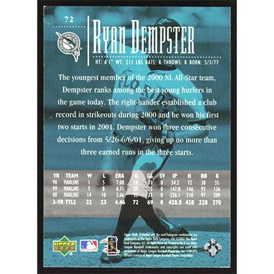 This is a 2001 Upper Deck Evolution Ryan Dempster baseball card. The card is #72 and pictures show condition.