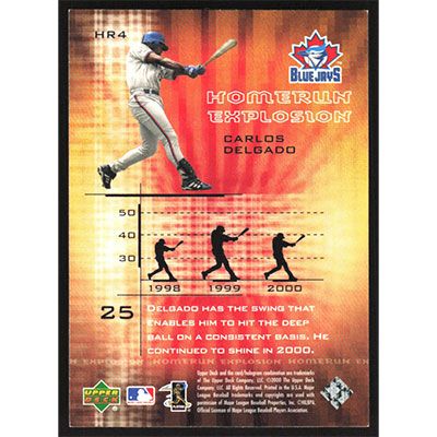 This is a 2001 Upper Deck Home Run Explosion Carlos Delgado baseball card. The card is #HR4 and pictures show condition.