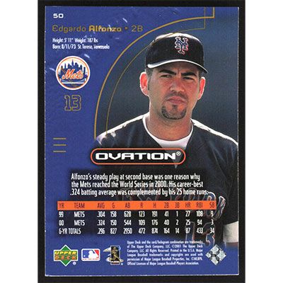 This is a 2001 Upper Deck Ovation Edgardo Alfonzo baseball card. The card is #50 and pictures show condition.
