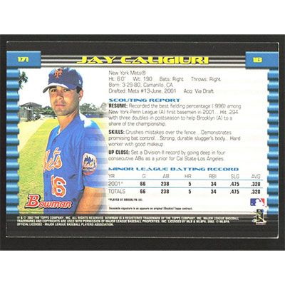 This is a 2002 Bowman Jay Caligiuri baseball card. The card is #171 and pictures show condition.