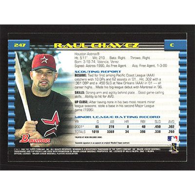 This is a 2002 Bowman Raul Chavez baseball card. The card is #247 and pictures show condition.