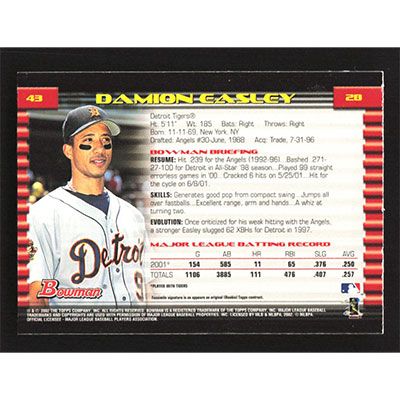 This is a 2002 Bowman Gold Damion Easley baseball card. The card is #43 and pictures show condition.