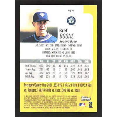 This is a 2002 Bowman's Best Bret Boone baseball card. The card is #90 and pictures show condition.