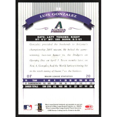 This is a 2002 Donruss Classics Luis Gonzalez baseball card. The card is #38 and pictures show condition.