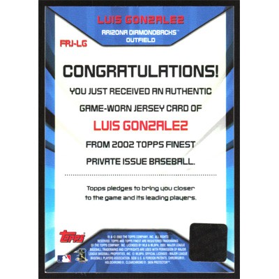 This is a 2002 Finest Jersey Relics Luis Gonzalez Game-Worn Jersey baseball card. The card is #FRJ-LG and pictures show condition. Team(s): Arizona Diamondbacks