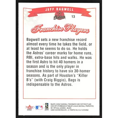This is a 2002 Fleer Jeff Bagwell Franchise Players baseball card. The card is #13 and pictures show condition.
