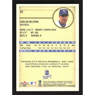 This is a 2002 Fleer Authentix Carlos Beltran baseball card. The card is #25 and pictures show condition.