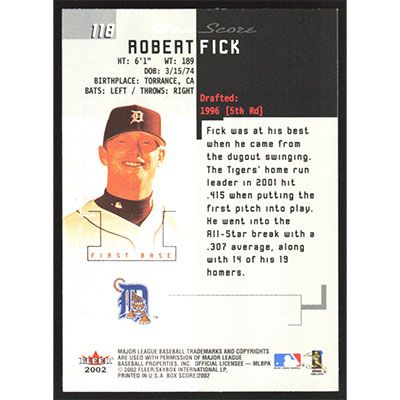 This is a 2002 Fleer Box Score Robert Fick baseball card. The card is #118 and pictures show condition.