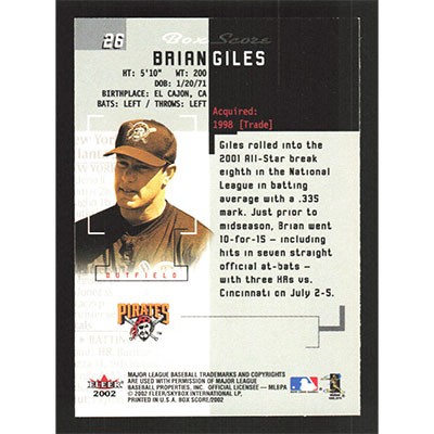 This is a 2002 Fleer Box Score Brian Giles baseball card. The card is #26 and pictures show condition.
