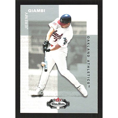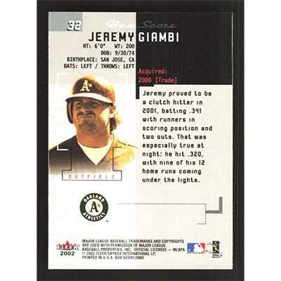 This is a 2002 Fleer Box Score Jeremy Giambi baseball card. The card is #32 and pictures show condition.