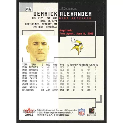 This is a 2002 Fleer Box Score Derrick Alexander football card. The card is #34 and pictures show condition.